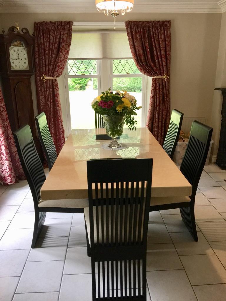 Grey marble louis dining table 1.6m wide with curved chrome leg & chairs option.